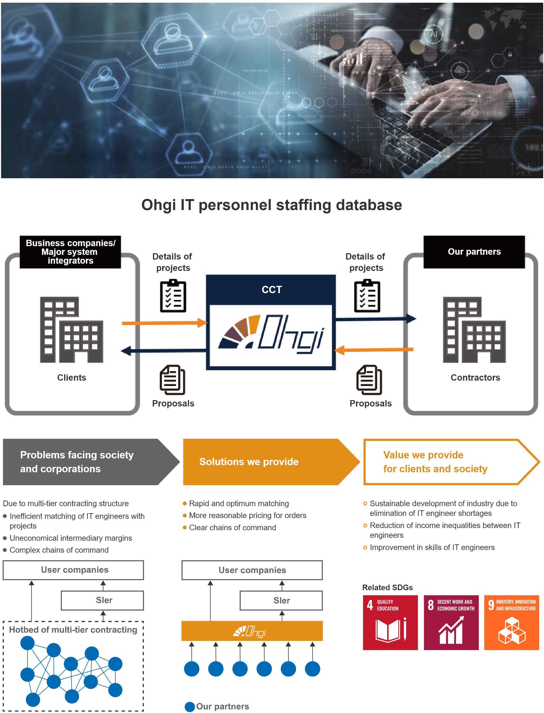A multi-tier contracting structure under which there are a number of intermediary agencies in between business companies that place orders for projects and the IT companies that actually carry out the work has become the norm in the Japanese system integration industry. As a result, adverse effects are observed, including income inequalities due to intermediary margins and increasingly complex chains of command. Using “Ohgi,” a large-scale database of small and medium-sized IT companies and their IT engineers, Core Concept Technologies has built a system that eliminates intermediary agencies and allows orders to be placed for a reasonable price directly with the small and medium-sized IT companies that actually carry out the work. In addition, bringing clients and contractors closer together provides work satisfaction for IT engineers and increases the potential for improving their skills. Through these initiatives, we seek to reduce IT engineer shortages and income inequalities to contribute to the sustainable development of the IT industry.