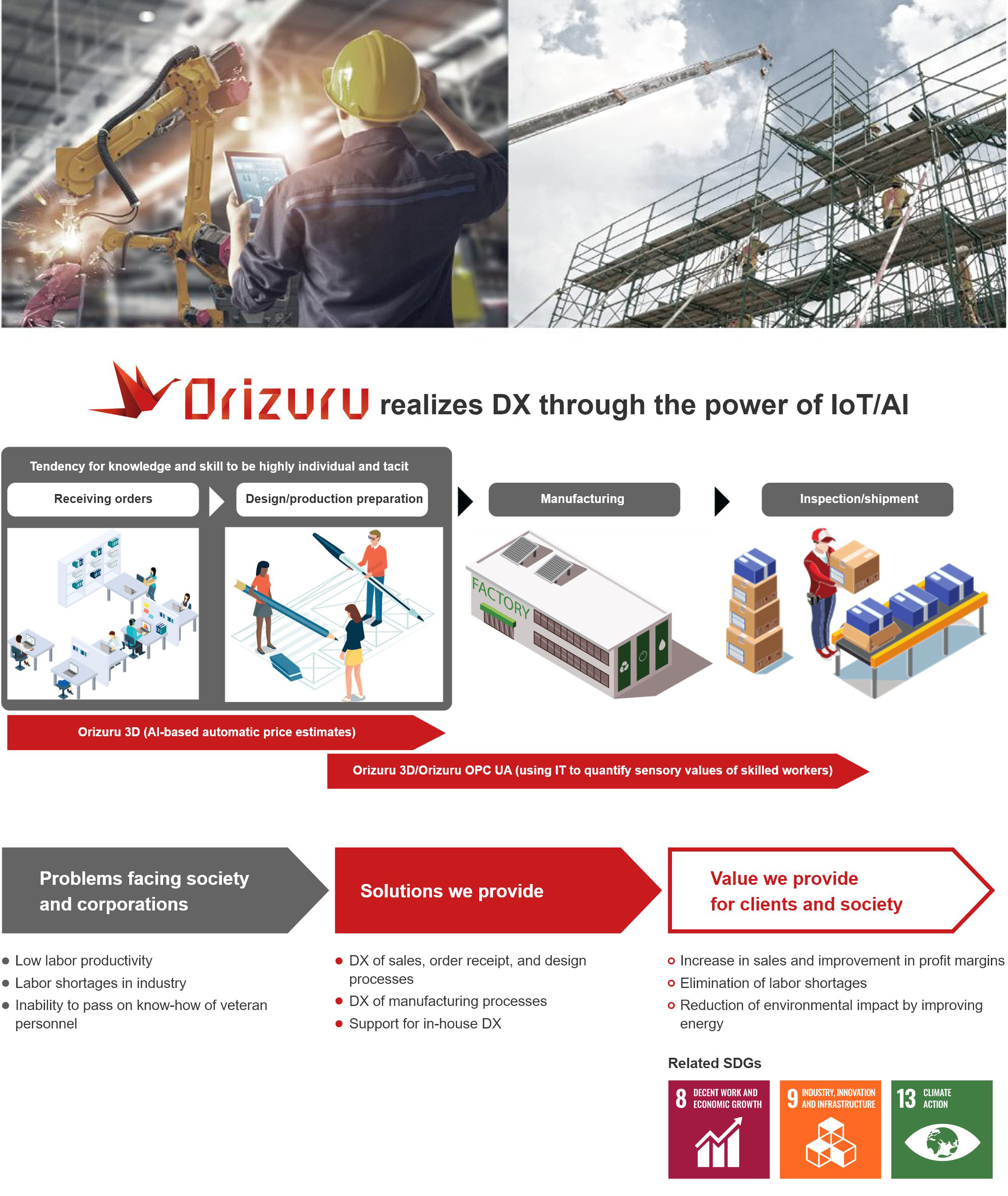 By using AI and IoT to provide support for automation and operational streamlining of design, procurement (receiving orders), and manufacturing processes, we increase sales and improve profit margins for our clients, as well as contributing to solving many social issues, such as improving asset efficiency, reducing environmental impact by energy efficiency, eliminating labor shortages by improving labor productivity, and passing on the know-how of veteran personnel.