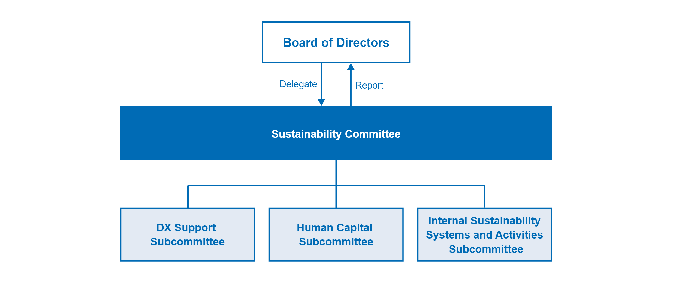 In December 2022, we established the Sustainability Committee chaired by the Representative Director, President, CEO. With authority delegated by the Board of Directors, the committee considers measures to realize the sustainable development of industry through business activities and reports to the Board of Directors.