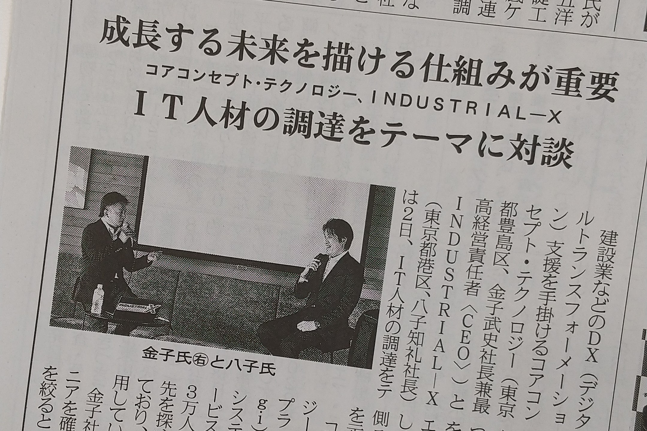 2021年11月4日発刊の日刊建設工業新聞に株式会社INDUSTRIAL-X代表取締役 八子知礼様と、弊社代表取締役CEO金子武史との対談の様子が掲載されました。