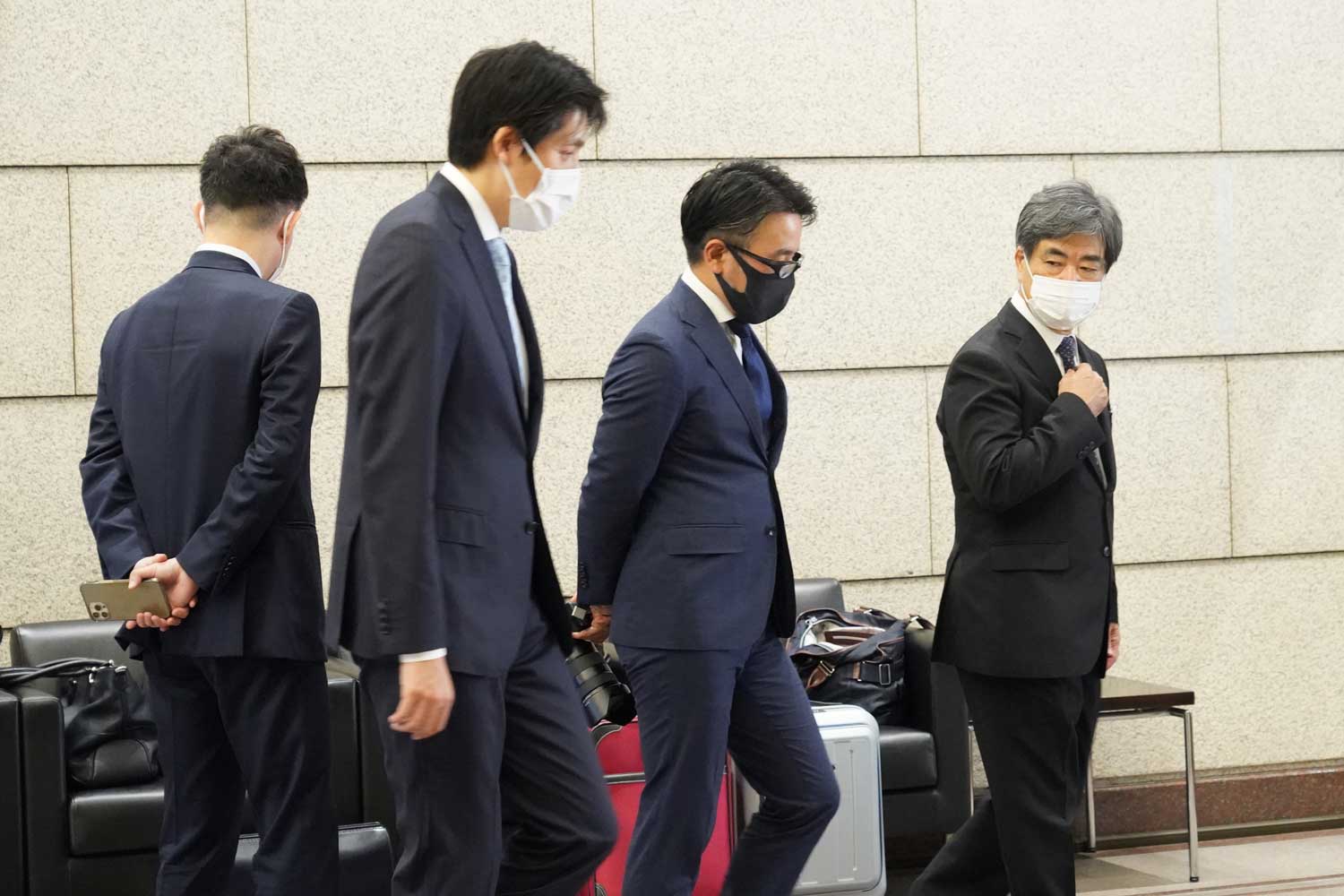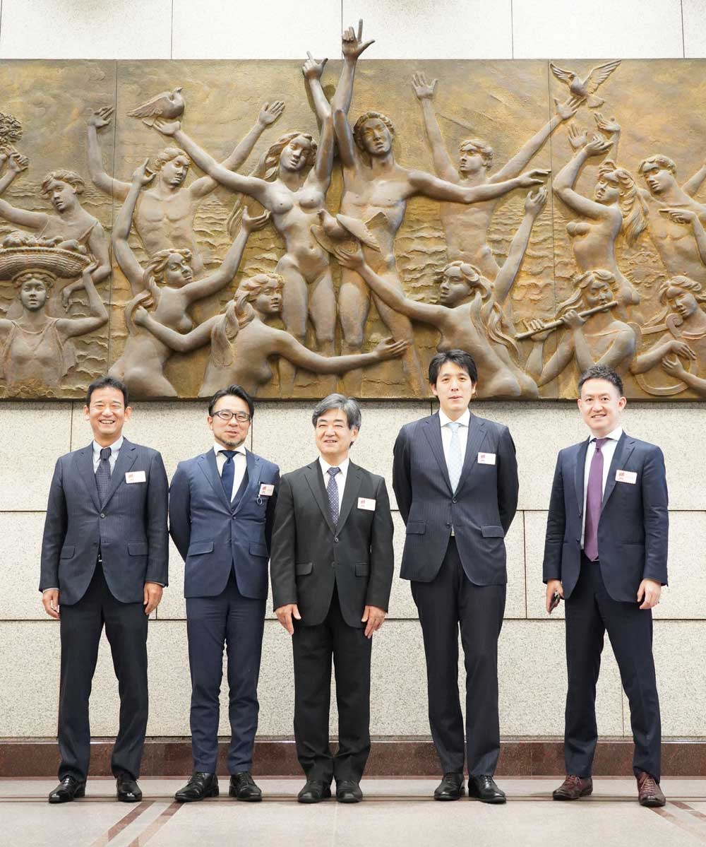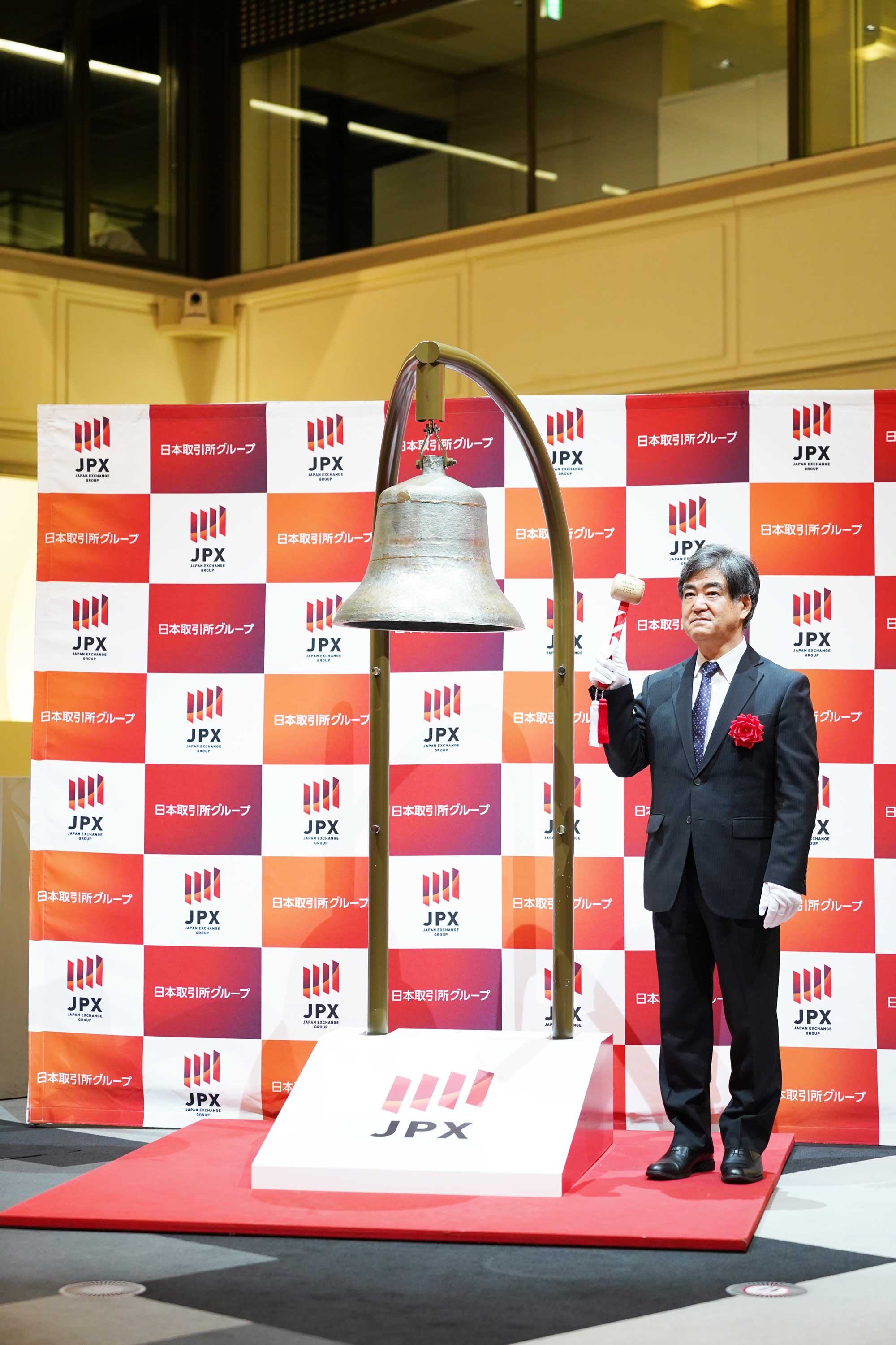 ロビーへお迎えにいらしたセレモニー担当者は皆さん胸に白い花をつけていらっしゃり、お祝いのムード満点。ここからは、新型コロナ対策もあり、代表を含め取締役の5名だけが会場に入ります。