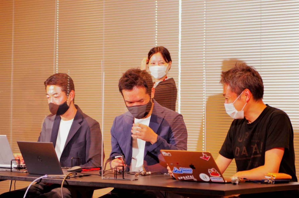 登壇者はSansan株式会社 Sansan Data Hub Unit Assistant General Manager 兼 Product Marketing Managerの久永 航氏、ウイングアーク1st株式会社Business Alliance事業推進室 室長 高橋 弘一 氏、そしてCCTからは社長室マネージャーの久保です。普段から一緒に業務にあたっていることもあり、和やかなムードでリハーサルが進んでいきます。
