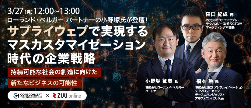 株式会社コアコンセプト・テクノロジー(本社:東京都豊島区、代表取締役社長CEO:金子武史)は、製造業のDXについて幅広い実績と先進的な知見を持ち、弊社のアドバイザーでもある株式会社東芝 福本氏、株式会社ローランドベルガー 小野塚氏をゲストに迎え、オンラインイベント「サプライウェブで実現するマスカスタマイゼーション時代の企業戦略 〜 持続可能な社会の創造に向けた新たなビジネスの可能性」を開催致します。