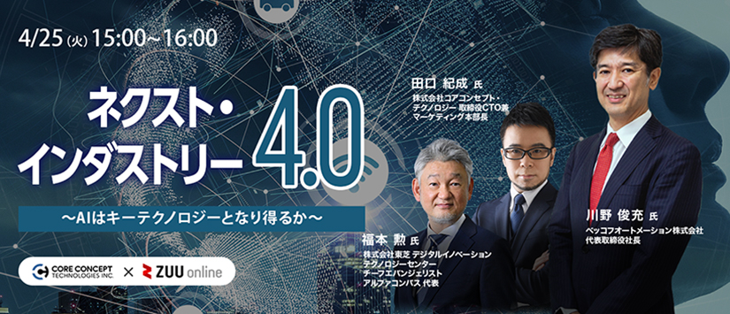 株式会社コアコンセプト・テクノロジー(本社:東京都豊島区、代表取締役社長CEO:金子武史)は、製造業のDXについて幅広い実績と先進的な知見を持ち、弊社のアドバイザーでもある株式会社東芝 福本氏、ドイツ大手制御機器メーカーであるベッコフオートメーション株式会社 代表取締役社長川野氏をゲストに迎え、製造業におけるAIの活用を議論するオンラインイベント「ネクスト・インダストリー4.0 ~AIはキーテクノロジーとなり得るか~」を開催致します。