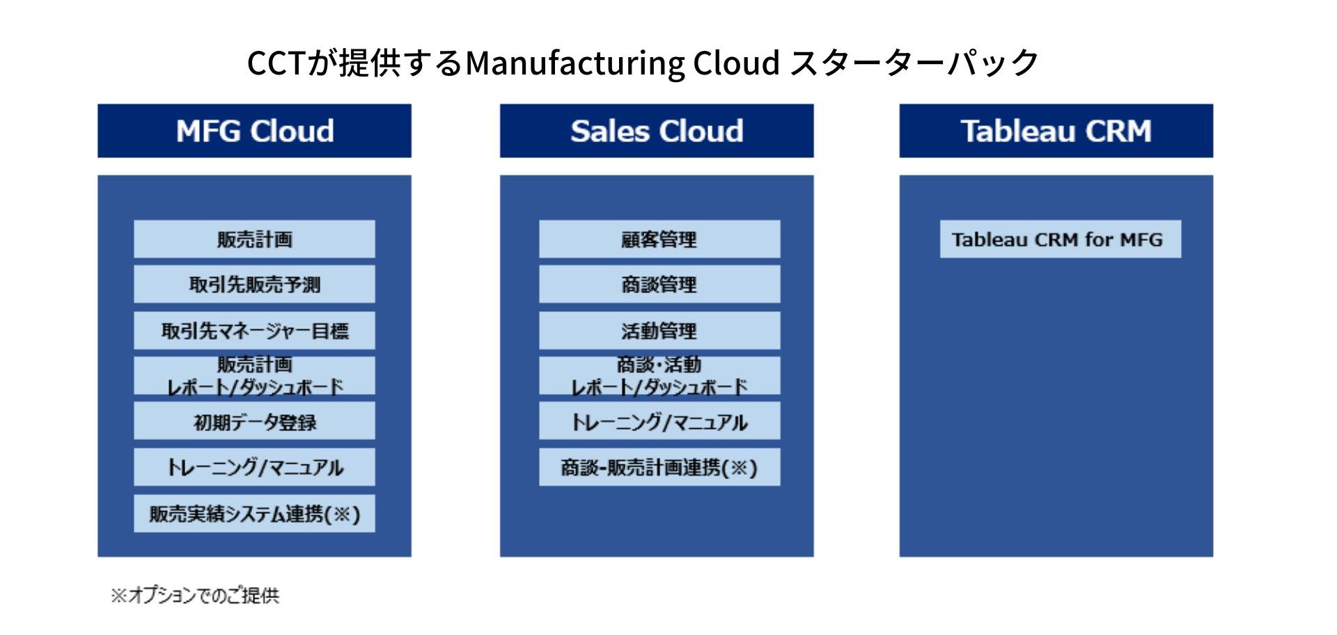 特に、SalesforceのSalesforce Manufacturing Cloudは製造業に特化した製品となっているので、情報の一元管理や業務効率化を行いたい場合には検討したい製品の一つです。CCT(コアコンセプト・テクノロジー)では、製造業のSalesforce導入に多くの実績があり、Manufacturing Cloudについて短期間で構築を行うパッケージのご提供をしております。