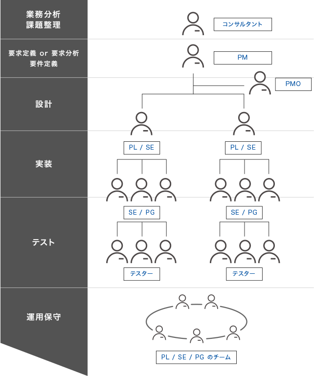 様々な業界(製造・金融・小売・物流・通信等)、役割(コンサルタント・PM・PMO・SE・PG等)、開発経験(各種システム開発・アプリ開発・インフラ構築等)、プログラミング言語(Java・C#・Python・C++・VB.NET・PHP等)、規模(1名~数十名)に対応が可能です。お客様のご要望にマッチした最適なチームを構築します。