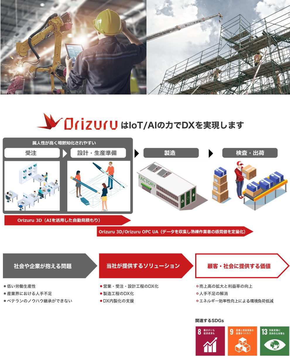 当社は、DX開発基盤「Orizuru」を活用して主に製造業・建設業のDXを支援しています。 AIやIoTを活用し、「設計」「調達(受注)」「製造」工程の自動化・業務効率化を支援することで、顧客の売上高の拡大や利益率の向上を実現するとともに、資産効率性の向上、エネルギー効率性の向上による環境負荷低減、労働生産性向上による人手不足の解消、ベテランのノウハウ継承など、多くの社会課題の解決に貢献しています。