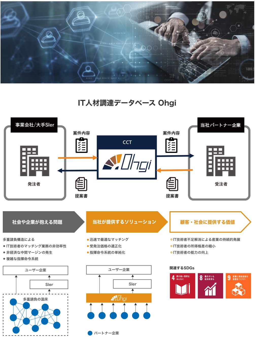 日本のシステムインテグレーション業界では、案件を発注する事業会社と、実際に作業を担うIT会社の間に何社もの会社が介在する「多重請負構造」が常態化しており、中間マージンによる所得格差や指揮命令系統の複雑化などの弊害が見られます。当社は中小IT会社とそこに所属するIT技術者の大規模データベース「Ohgi」により、中間階層を排除し、直接作業を行う中小IT会社へ適正な価格で発注できる体制を構築しています。また、発注者と受注者の距離を近づけることでIT技術者がやりがいを感じ、能力向上の可能性が広がります。こうした取り組みにより、IT技術者不足と所得格差を解消し、IT産業の持続可能な発展を目指します。
