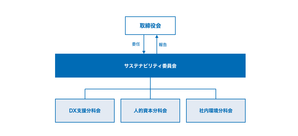 当社は、2022年12月に代表取締役社長CEOを委員長とする「サステナビリティ委員会」を設置しました。委員会では、取締役会から委任を受け、事業活動を通じて産業のサステナブルな発展を実現するための施策を検討し、取締役会に報告します。
